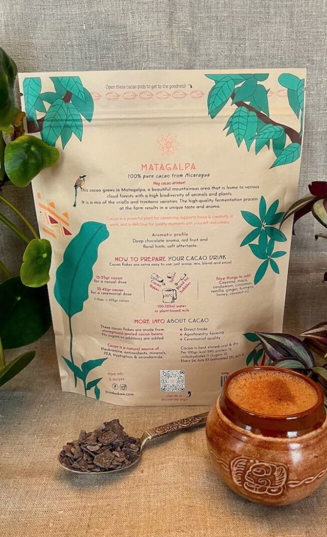 Made from whole cacao beans, ground into a fine paste that dissolves easily in your drink. Our cacao flakes are similar to a block, but extra easy to use: just scoop and mix into a frothy drink. Put them next to your coffee and tea at home or at work to enjoy in your daily life.