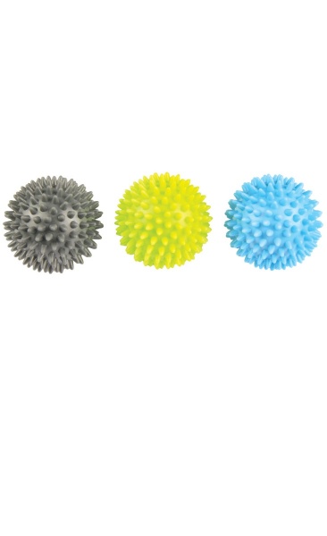 Set of 3 spikey massage trigger balls, perfect for -trigger point- self-massage. Use to help release muscle tension which can also help to release toxins and improve circulation. Lightweight and easy to carry you can take them with you for use before or after your workout. This set of 3 balls offers you the choice of 3 different hardnesses meaning if using for rehab purposes you can use progressively, or use different hardnesses for different areas of the body.